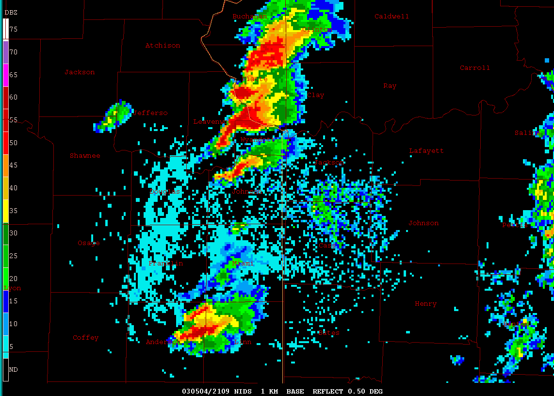 now-elevated supercell exiting kansas city metro; distant supercell to the south